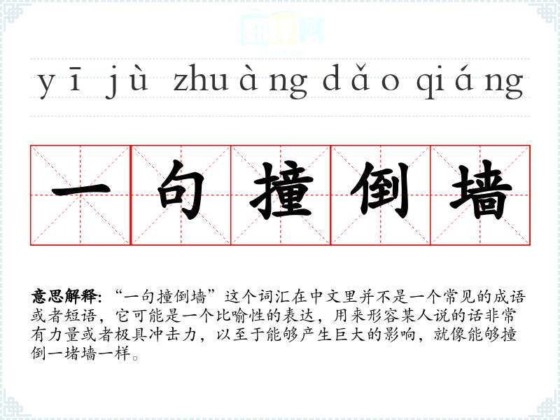 “一句撞倒墙”这个词汇在中文里并不是一个常见的成语或者短语,它可能是一个比喻性的表达,用来形容某人说的话非常有力量或者极具冲击力,以至于能够产生巨大的影响,就像能够撞倒一堵墙一样。