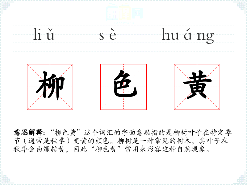 “柳色黄”这个词汇的字面意思指的是柳树叶子在特定季节(通常是秋季)变黄的颜色。柳树是一种常见的树木,其叶子在秋季会由绿转黄,因此“柳色黄”常用来形容这种自然现象。