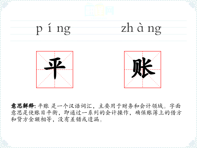 平账 是一个在财务和会计领域非常重要的词汇,它不仅代表了账目的平衡,也象征着精确和诚信。在学*语言和表达中,理解这样的专业词汇有助于更准确地沟通和表达。