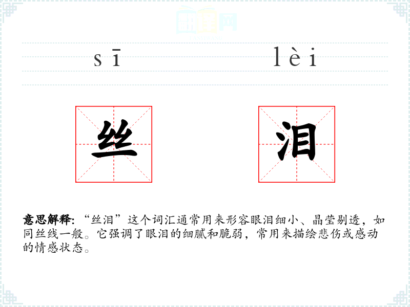 “丝泪”这个词汇可能是由“丝”和“泪”两个字组合而成,强调了眼泪的细腻和连续性。在古代文学中,类似的表达方式已经出现,随着时间的推移,这个词汇逐渐被用来形容更加细腻的情感表达。