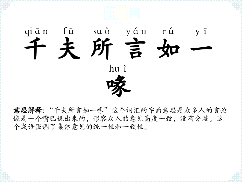 “千夫所言如一喙”这个词汇的字面意思是众多人的言论像是一个嘴巴说出来的,形容众人的意见高度一致,没有分歧。这个成语强调了集体意见的统一性和一致性。