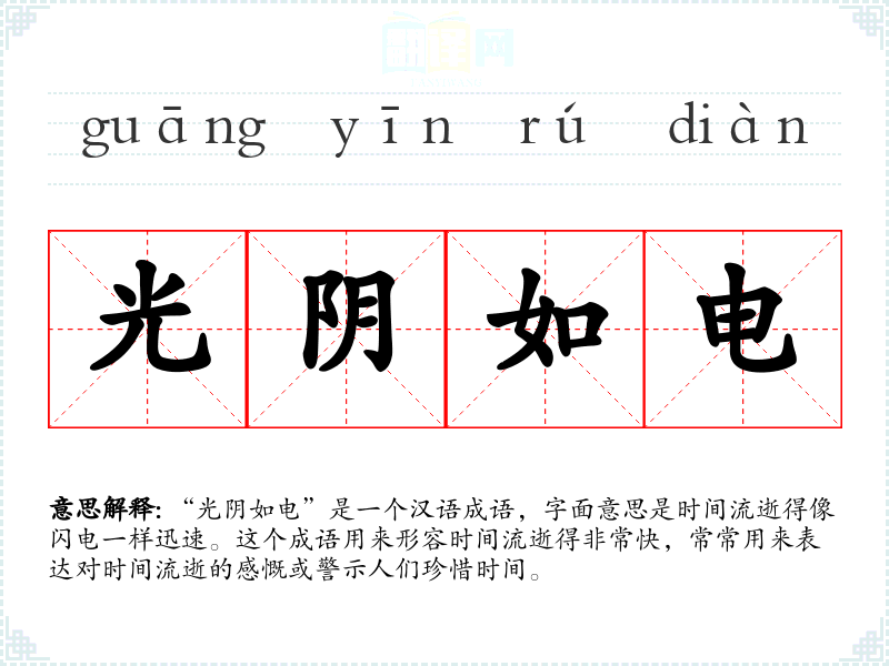 “光阴如电”这个成语源自**古代文学,特别是在诗词和散文中常见。它的使用可以追溯到宋代,后来逐渐成为常用的表达方式。