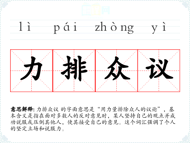 力排众议 的字面意思是“用力量排除众人的议论”,基本含义是指在面对多数人的反对意见时,某人坚持自己的观点并成功说服或压倒其他人,使其接受自己的意见。这个词汇强调了个人的坚定立场和说服力。