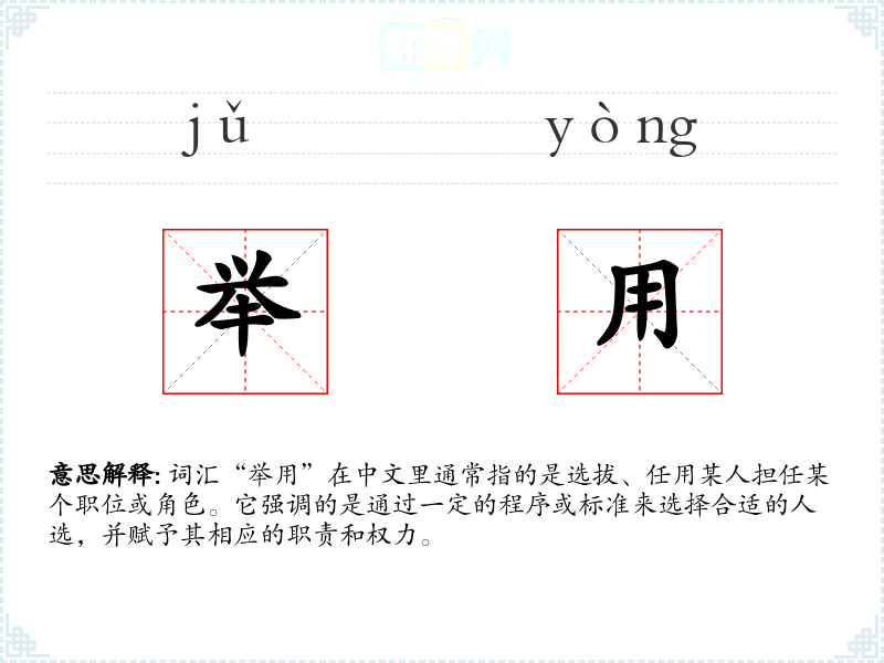 “举用”这个词在中文中具有特定的文化和社会背景,它不仅仅是一个简单的选拔或任用的动作,还涉及到一系列的程序和标准。在语言学*和表达中,理解“举用”的深层含义有助于更准确地把握和运用这个词汇。
