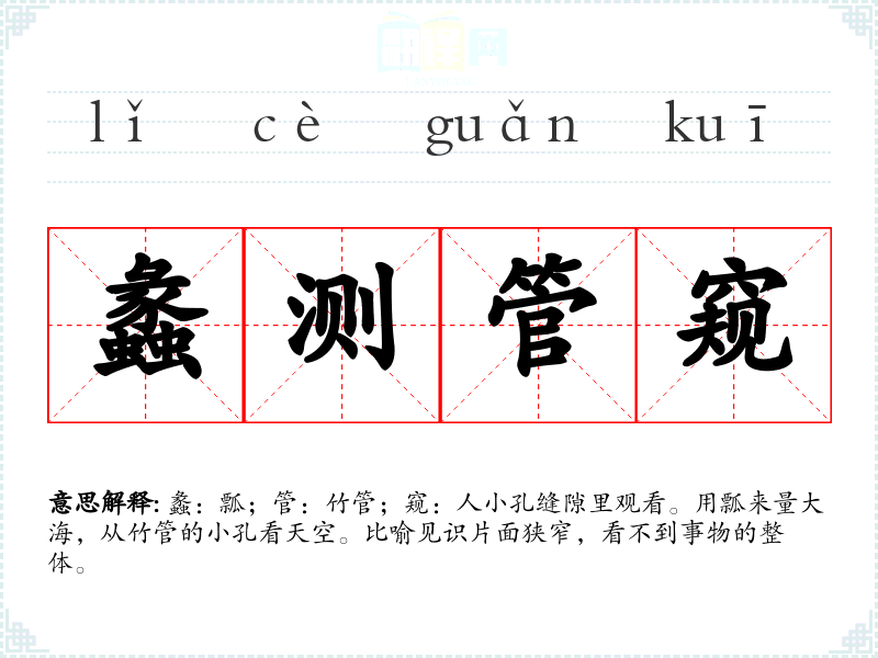 蠡:瓢;管:竹管;窥:人小孔缝隙里观看。用瓢来量大海,从竹管的小孔看天空。比喻见识片面狭窄,看不到事物的整体。