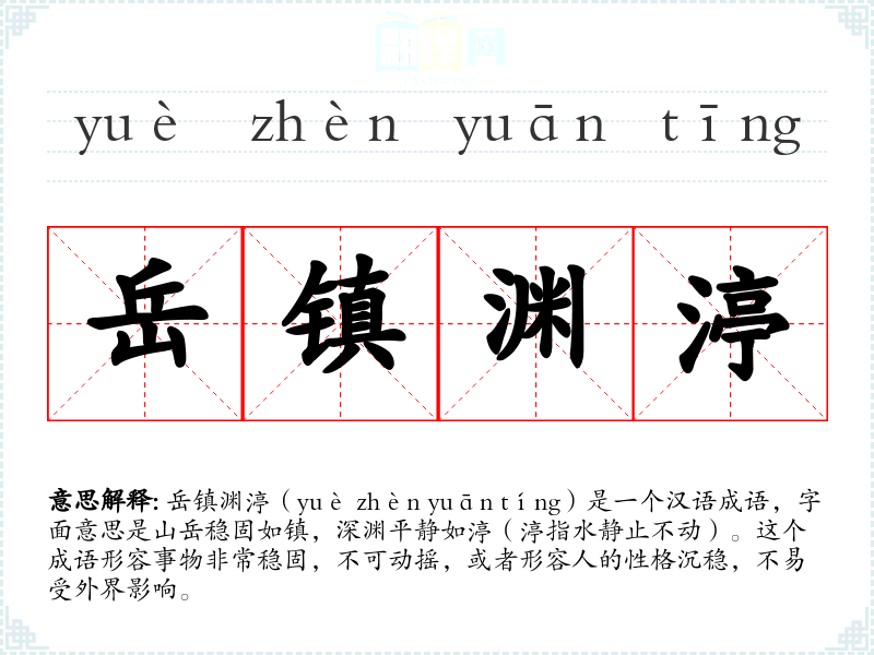 岳镇渊渟(yuè zhèn yuān tíng)是一个汉语成语,字面意思是山岳稳固如镇,深渊平静如渟(渟指水静止不动)。这个成语形容事物非常稳固,不可动摇,或者形容人的性格沉稳,不易受外界影响。