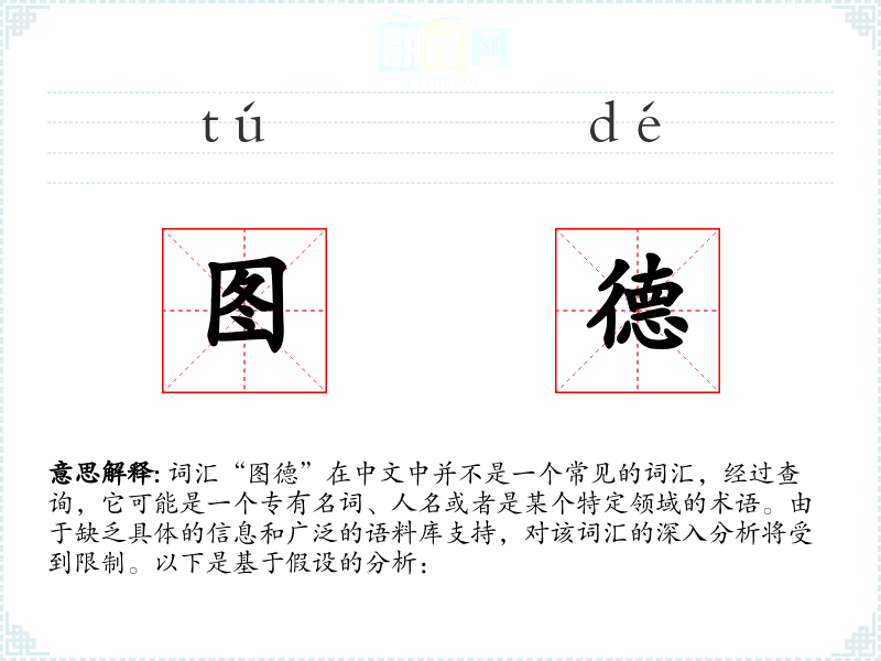 词汇“图德”在中文中并不是一个常见的词汇,经过查询,它可能是一个专有名词、人名或者是某个特定领域的术语。由于缺乏具体的信息和广泛的语料库支持,对该词汇的深入分析将受到限制。以下是基于假设的分析: