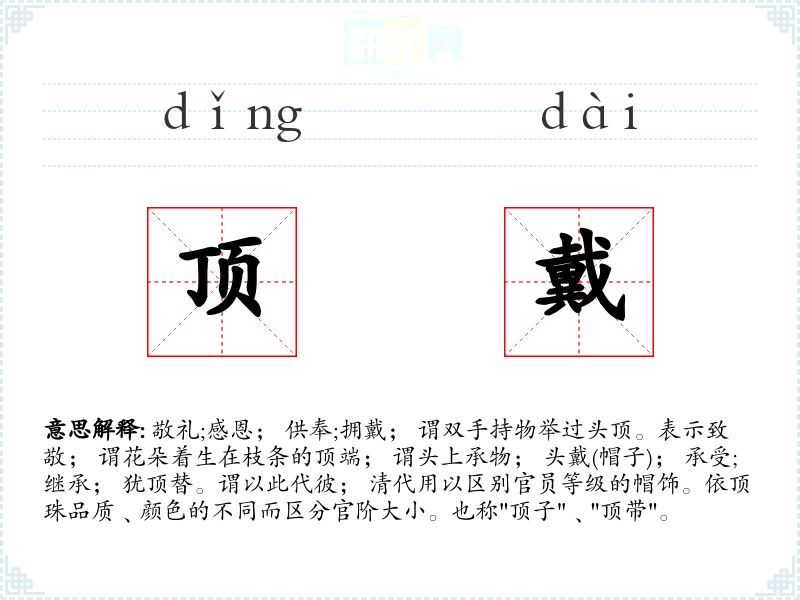1.敬礼;感恩; 供奉;拥戴; 谓双手持物举过头顶。表示致敬; 谓花朵着生在枝条的顶端; 谓头上承物; 头戴(帽子); 承受;继承; 犹顶替。谓以此代彼; 清代用以区别官员等级的帽饰。依顶珠品质﹑颜色的不同而区分官阶大小。也称"顶子"﹑"顶带"。