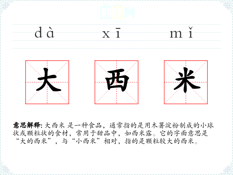 "大西米"的意思解释、大西米是什么意思由翻译网汉语词典查词提供。