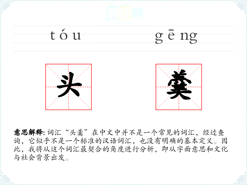 词汇“头羹”在中文中并不是一个常见的词汇,经过查询,它似乎不是一个标准的汉语词汇,也没有明确的基本定义。因此,我将从这个词汇最契合的角度进行分析,即从字面意思和文化与社会背景出发。