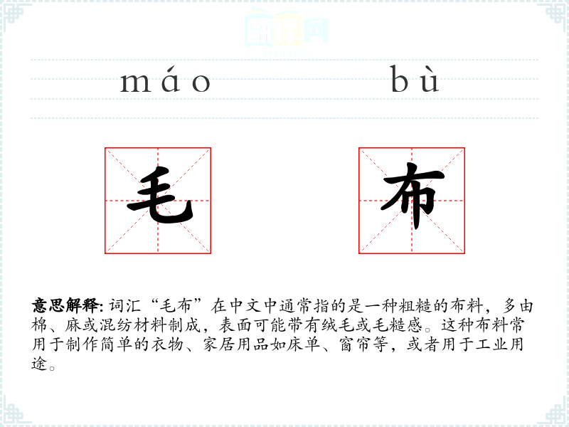 词汇“毛布”在中文中通常指的是一种粗糙的布料,多由棉、麻或混纺材料制成,表面可能带有绒毛或毛糙感。这种布料常用于制作简单的衣物、家居用品如床单、窗帘等,或者用于工业用途。