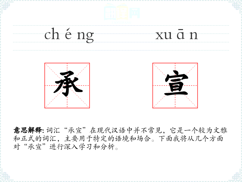 “承宣”是一个具有历史和文化背景的词汇,虽然在现代汉语中不常用,但它体现了语言的丰富性和历史的深度。了解和学*这样的词汇,有助于更好地理解语言的演变和文化传承。