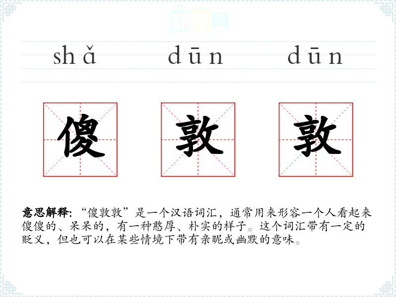 “傻敦敦”是一个汉语词汇,通常用来形容一个人看起来傻傻的、呆呆的,有一种憨厚、朴实的样子。这个词汇带有一定的贬义,但也可以在某些情境下带有亲昵或幽默的意味。
