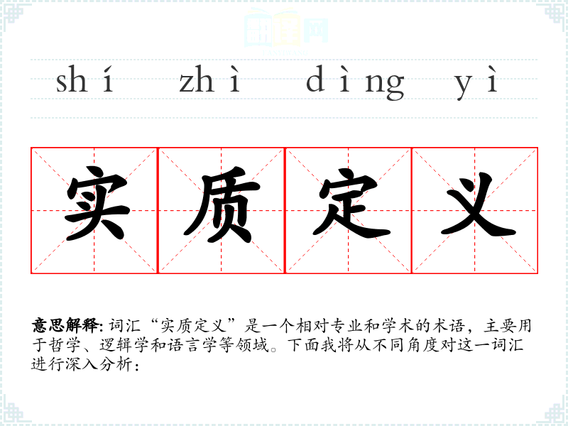 词汇“实质定义”是一个相对专业和学术的术语,主要用于哲学、逻辑学和语言学等领域。下面我将从不同角度对这一词汇进行深入分析: