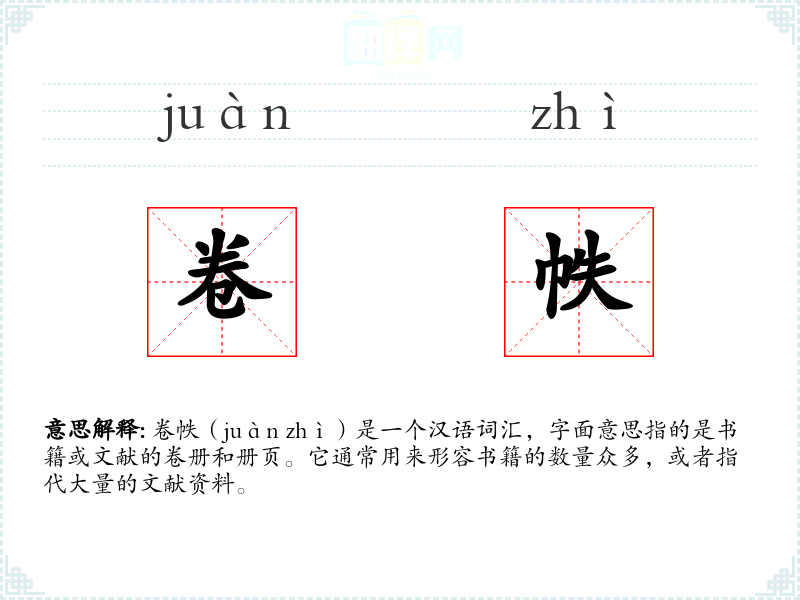 卷帙(juàn zhì)是一个汉语词汇,字面意思指的是书籍或文献的卷册和册页。它通常用来形容书籍的数量众多,或者指代大量的文献资料。