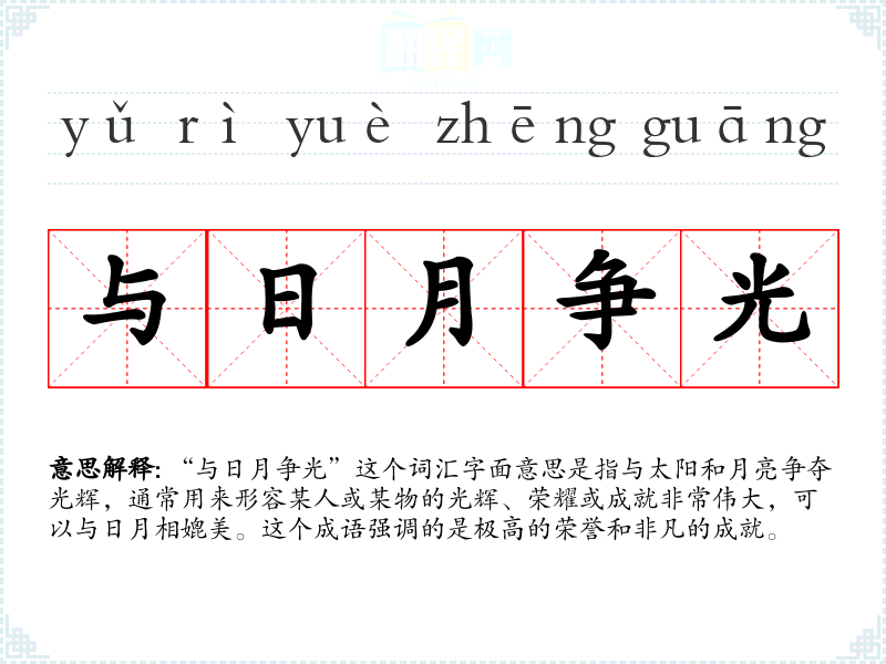 “与日月争光”这个词汇字面意思是指与太阳和月亮争夺光辉,通常用来形容某人或某物的光辉、荣耀或成就非常伟大,可以与日月相媲美。这个成语强调的是极高的荣誉和非凡的成就。