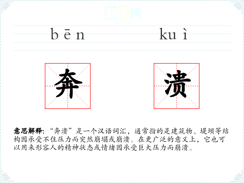“奔溃”是一个汉语词汇,通常指的是建筑物、堤坝等结构因承受不住压力而突然崩塌或崩溃。在更广泛的意义上,它也可以用来形容人的精神状态或情绪因承受巨大压力而崩溃。