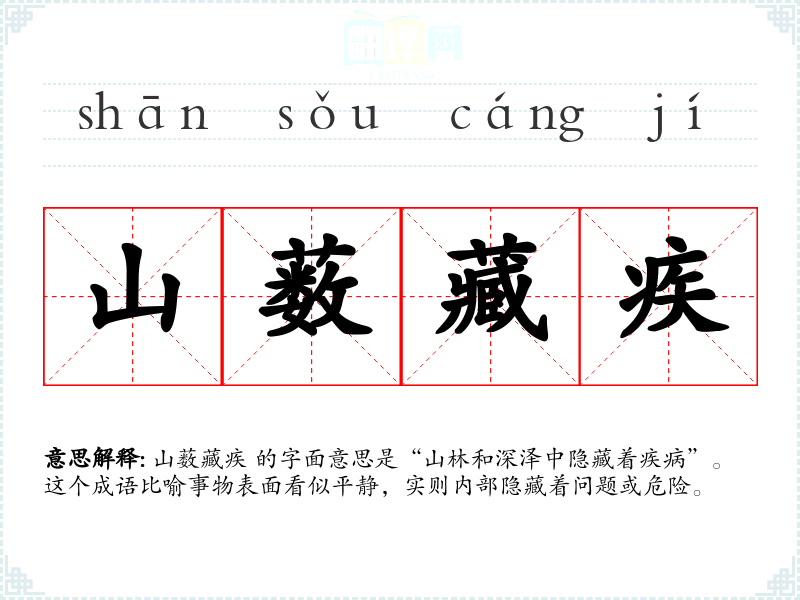 山薮藏疾 的字面意思是“山林和深泽中隐藏着疾病”。这个成语比喻事物表面看似平静,实则内部隐藏着问题或危险。