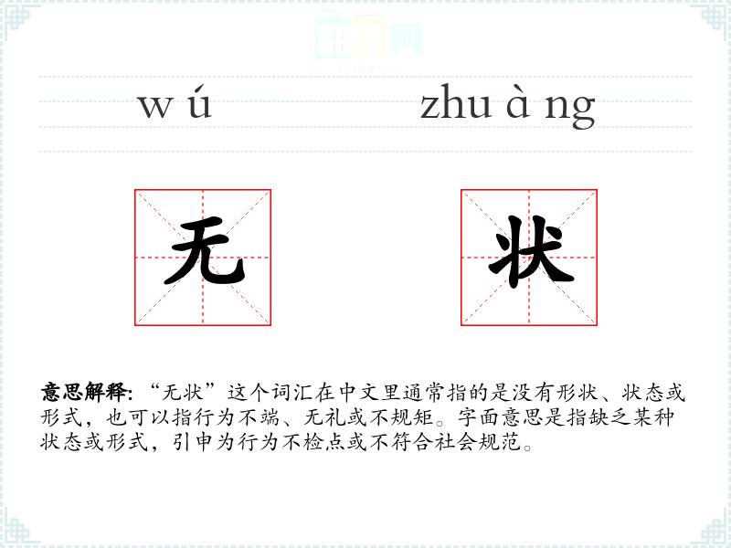 “无状”这个词汇在中文里通常指的是没有形状、状态或形式,也可以指行为不端、无礼或不规矩。字面意思是指缺乏某种状态或形式,引申为行为不检点或不符合社会规范。