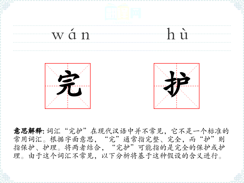 词汇“完护”在现代汉语中并不常见,它不是一个标准的常用词汇。根据字面意思,“完”通常指完整、完全,而“护”则指保护、护理。将两者结合,“完护”可能指的是完全的保护或护理。由于这个词汇不常见,以下分析将基于这种假设的含义进行。
