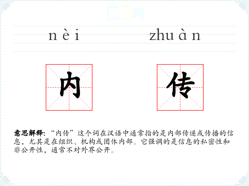 “内传”这个词在汉语中通常指的是内部传递或传播的信息,尤其是在组织、机构或团体内部。它强调的是信息的私密性和非公开性,通常不对外界公开。