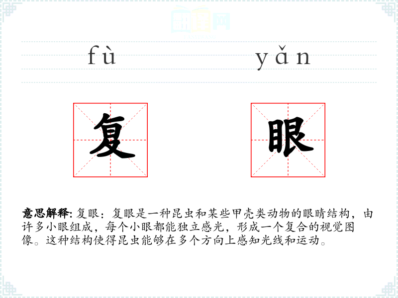 词源:复眼一词由“复”和“眼”组成,“复”表示复合或多个,“眼”表示视觉器官。