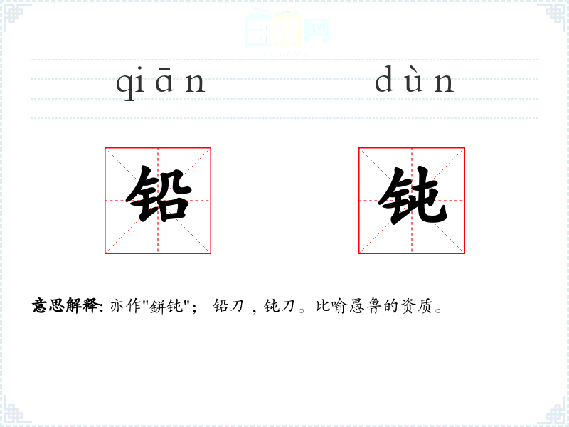 亦作"鉼钝"; 铅刀﹐钝刀。比喻愚鲁的资质。