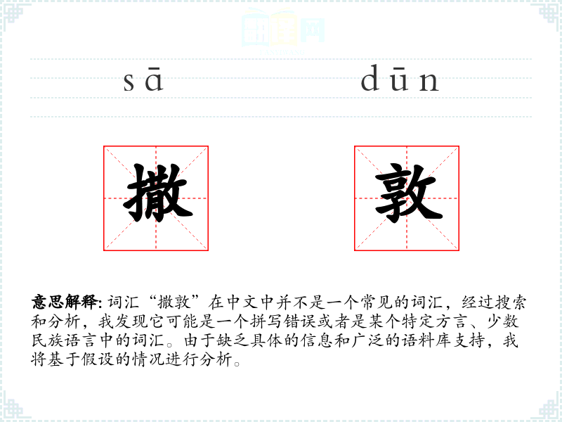 由于“撒敦”不是一个已知的词汇,对其的理解和分析非常有限。在语言学习和表达中,了解词汇的准确含义和使用场景是非常重要的。对于不熟悉的词汇,应当寻求专业的语言学支持或具体的语境信息。