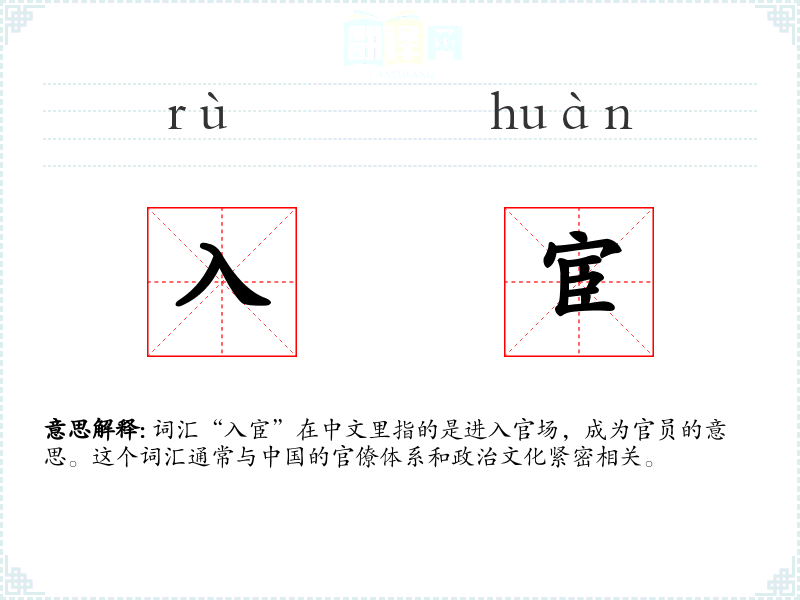 词汇“入宦”在中文里指的是进入官场,成为官员的意思。这个词汇通常与中国的官僚体系和政治文化紧密相关。