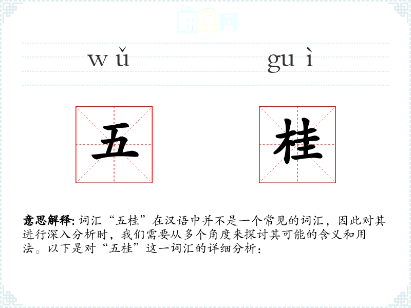 - 反义词:无(由于“五桂”不是一个常用词汇,反义词可能不适用)