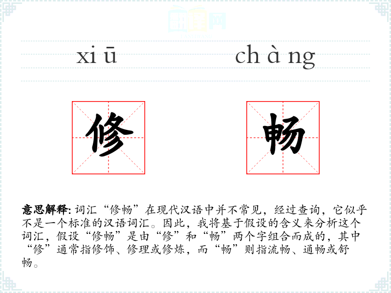 词汇“修畅”在现代汉语中并不常见,经过查询,它似乎不是一个标准的汉语词汇。因此,我将基于假设的含义来分析这个词汇,假设“修畅”是由“修”和“畅”两个字组合而成的,其中“修”通常指修饰、修理或修炼,而“畅”则指流畅、通畅或舒畅。