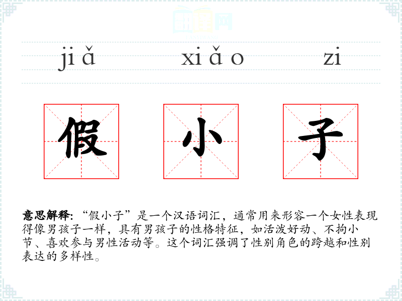 “假小子”是一个汉语词汇,通常用来形容一个女性表现得像男孩子一样,具有男孩子的性格特征,如活泼好动、不拘小节、喜欢参与男性活动等。这个词汇强调了性别角色的跨越和性别表达的多样性。