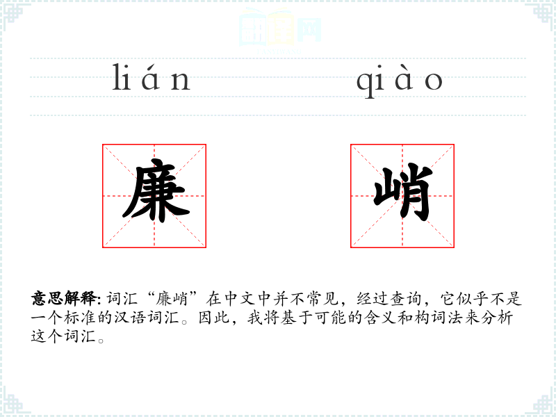 词汇“廉峭”在中文中并不常见,经过查询,它似乎不是一个标准的汉语词汇。因此,我将基于可能的含义和构词法来分析这个词汇。