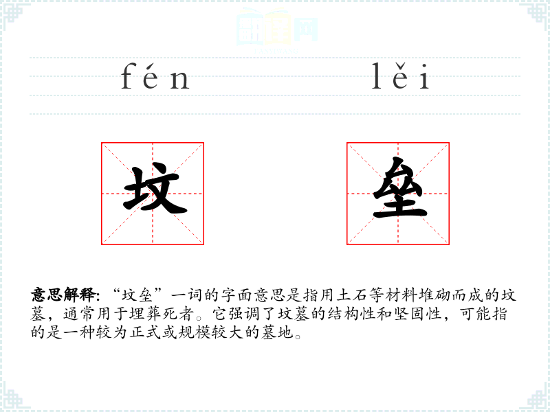 “坟垒”一词的字面意思是指用土石等材料堆砌而成的坟墓,通常用于埋葬死者。它强调了坟墓的结构性和坚固性,可能指的是一种较为正式或规模较大的墓地。
