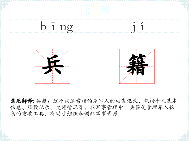 - 专业领域:在军事学、国防管理等领域,兵籍是一个专业术语,用于指代军人的详细档案记录。