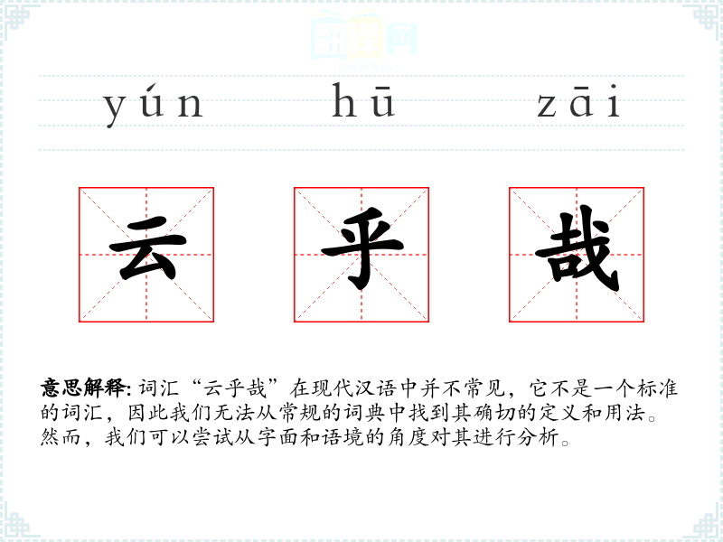 词汇“云乎哉”在现代汉语中并不常见,它不是一个标准的词汇,因此我们无法从常规的词典中找到其确切的定义和用法。然而,我们可以尝试从字面和语境的角度对其进行分析。