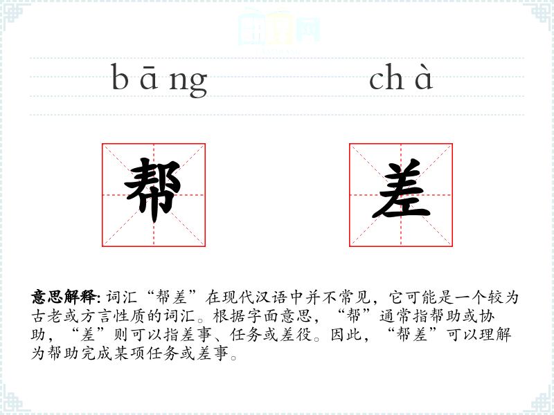 词汇“帮差”在现代汉语中并不常见,它可能是一个较为古老或方言性质的词汇。根据字面意思,“帮”通常指帮助或协助,“差”则可以指差事、任务或差役。因此,“帮差”可以理解为帮助完成某项任务或差事。