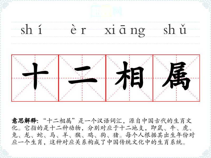 “十二相属”不仅是一个词汇,更是一种文化符号,它承载了丰富的历史和文化信息。在语言学*和表达中,了解和运用这一词汇,有助于更深入地理解**文化,增强跨文化交流的能力。