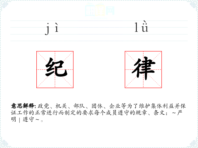 政党、机关、部队、团体、企业等为了维护集体利益并保证工作的正常进行而制定的要求每个成员遵守的规章、条文:~严明|遵守~。