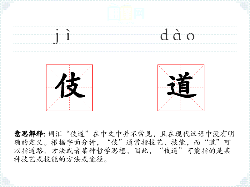 词汇“伎道”在中文中并不常见,且在现代汉语中没有明确的定义。根据字面分析,“伎”通常指技艺、技能,而“道”可以指道路、方法或者某种哲学思想。因此,“伎道”可能指的是某种技艺或技能的方法或途径。