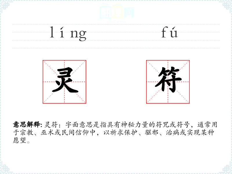 - 反义词:无(灵符作为一种神秘符号,通常没有直接的反义词)