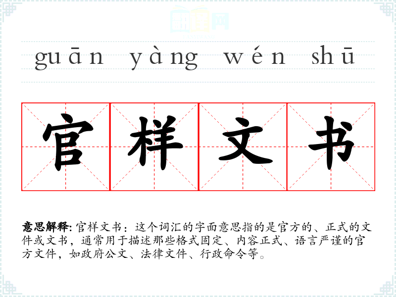 官样文书:这个词汇的字面意思指的是官方的、正式的文件或文书,通常用于描述那些格式固定、内容正式、语言严谨的官方文件,如政府公文、法律文件、行政命令等。