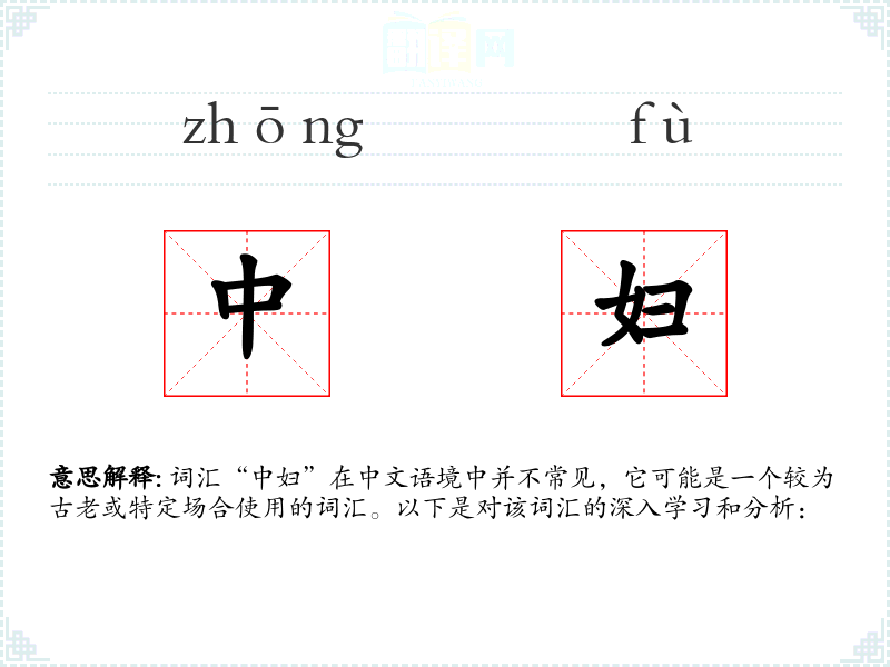 词汇“中妇”在中文语境中并不常见,它可能是一个较为古老或特定场合使用的词汇。以下是对该词汇的深入学*和分析: