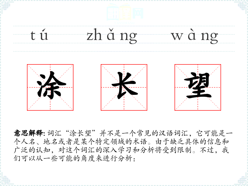 词汇“涂长望”并不是一个常见的汉语词汇,它可能是一个人名、地名或者是某个特定领域的术语。由于缺乏具体的信息和广泛的认知,对这个词汇的深入学习和分析将受到限制。不过,我们可以从一些可能的角度来进行分析: