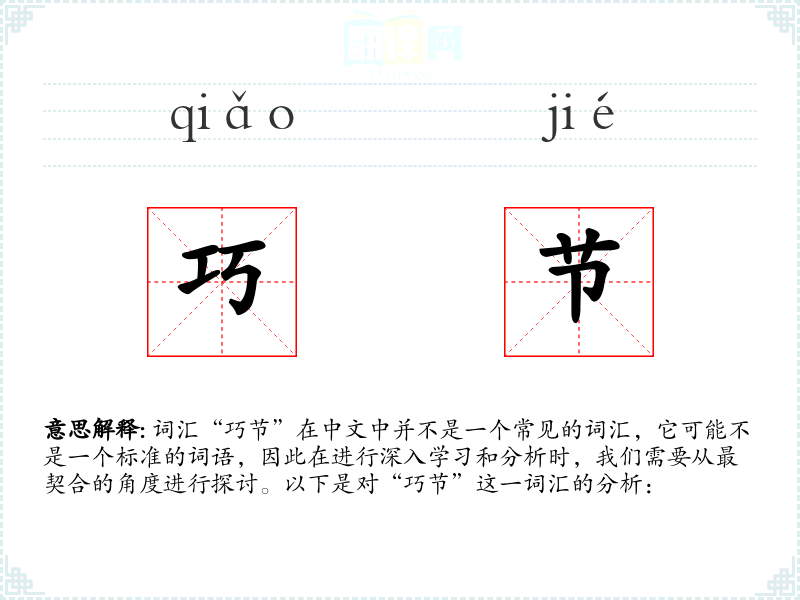 由于“巧节”不是一个标准词汇,它的词源和历史演变难以追溯。它可能是由“巧”和“节”两个字组合而成的临时性表达。