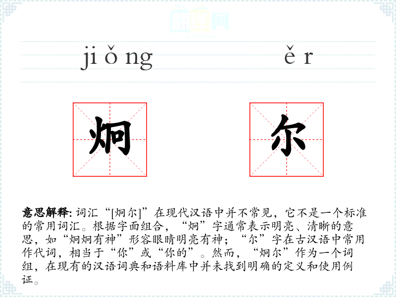 词汇“[炯尔]”在现代汉语中并不常见,它不是一个标准的常用词汇。根据字面组合,“炯”字通常表示明亮、清晰的意思,如“炯炯有神”形容眼睛明亮有神;“尔”字在古汉语中常用作代词,相当于“你”或“你的”。然而,“炯尔”作为一个词组,在现有的汉语词典和语料库中并未找到明确的定义和使用例证。