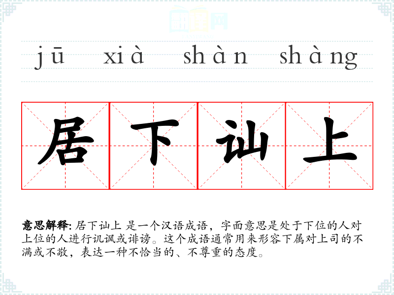 居下讪上 是一个汉语成语,字面意思是处于下位的人对上位的人进行讥讽或诽谤。这个成语通常用来形容下属对上司的不满或不敬,表达一种不恰当的、不尊重的态度。