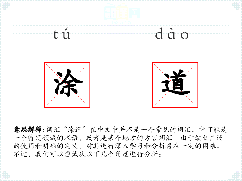 综上所述,由于“涂道”不是一个标准的中文词汇,我们无法对其进行深入的学习和分析。如果“涂道”是一个特定领域的术语或者是某个地方的方言词汇,建议查阅相关领域的资料或咨询当地人士以获取更准确的信息。