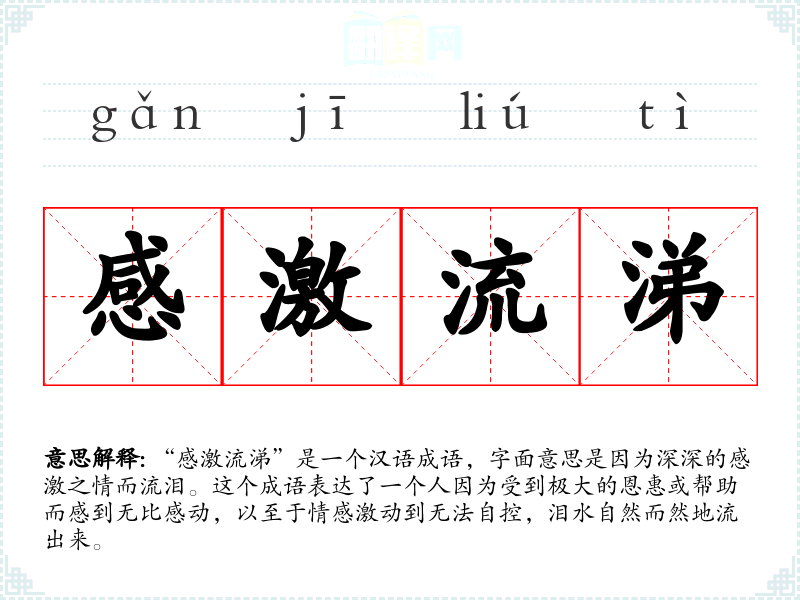 “感激流涕”是一个汉语成语,字面意思是因为深深的感激之情而流泪。这个成语表达了一个人因为受到极大的恩惠或帮助而感到无比感动,以至于情感激动到无法自控,泪水自然而然地流出来。