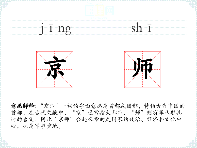 “京师”这个词不仅是一个地理名词,更是一个文化符号,它承载着丰富的历史和文化信息。在学*汉语和了解**文化的过程中,理解“京师”的含义和用法是非常重要的。